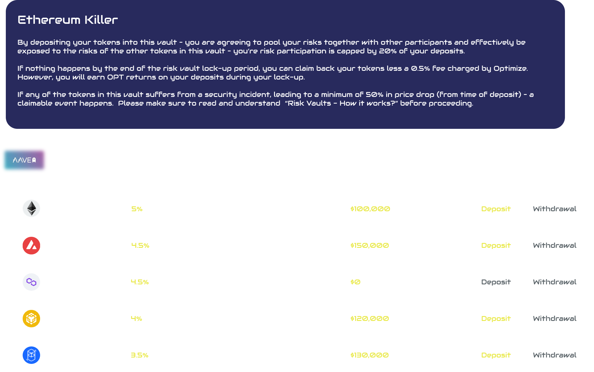 For illustrative purposes (see below), the Optymize Vault has 5 pre-determined tokens and has a total capacity of US$500,000. Once the Optymize Vault is created, it will accept staking from depositors for the 5 tokens until capacity of each token of US$100,000 is reached. Each depositor can stake more than one type of token into the Optymize Vault.